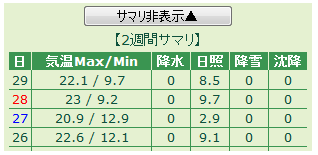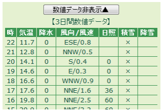 また、3日間、10日間については毎時の数値データ、30日間については毎日のサマリーデータ(最低気温、最高気温、総降水量、総日照時間、降雪量、沈降量)を確認できます。