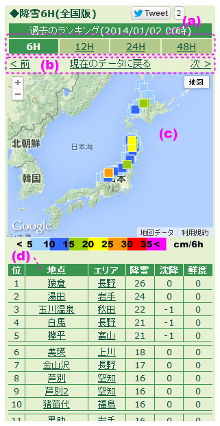 観測地点のデータ同様、過去のランキングを検索できます(本年度と昨年度)。最初にデータ期間(6時間、12時間、24時間、48時間)を選択してください。