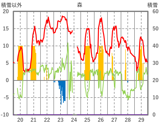 | 日 | 時 | 気温 | 降水 | 風向/風速 | 日照 | 積雪 | 降雪 |