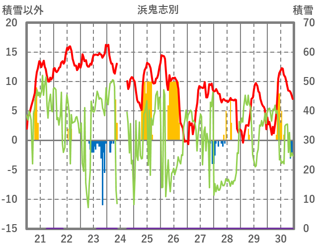 | 日 | 時 | 気温 | 降水 | 風向/風速 | 日照 | 積雪 | 降雪 |