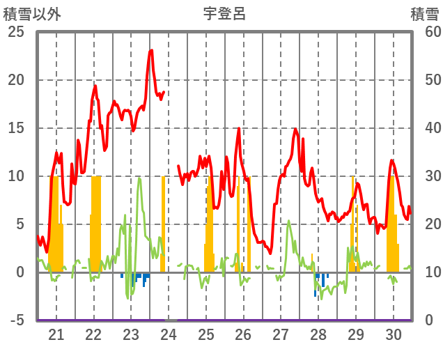 | 日 | 時 | 気温 | 降水 | 風向/風速 | 日照 | 積雪 | 降雪 |