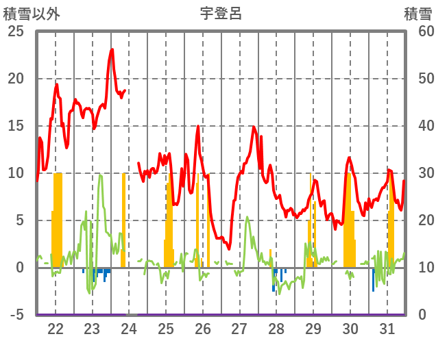 | 日 | 時 | 気温 | 降水 | 風向/風速 | 日照 | 積雪 | 降雪 |