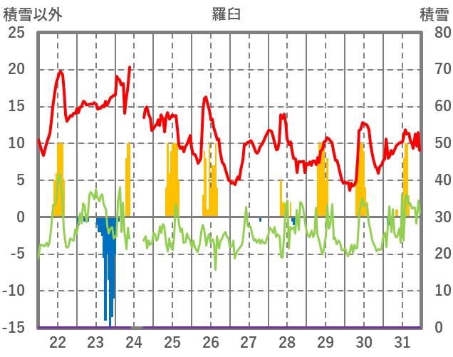 | 日 | 時 | 気温 | 降水 | 風向/風速 | 日照 | 積雪 | 降雪 |