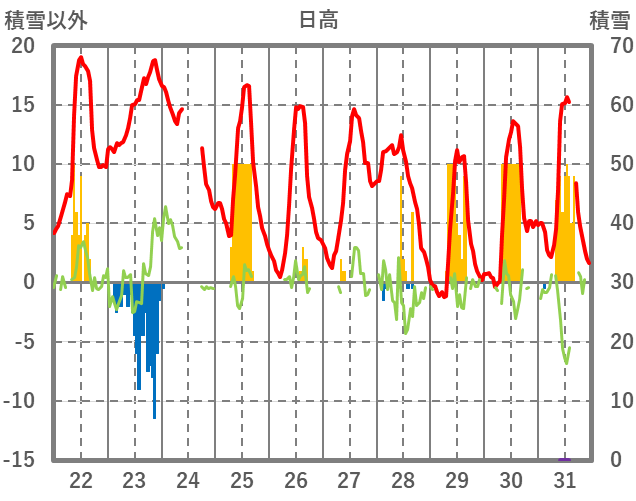 | 日 | 時 | 気温 | 降水 | 風向/風速 | 日照 | 積雪 | 降雪 |