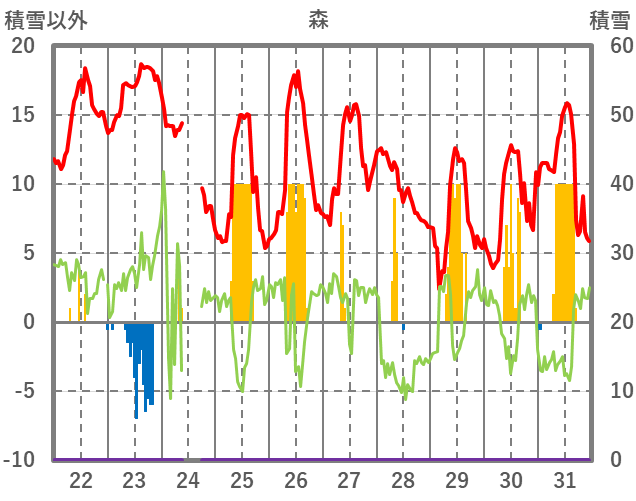 | 日 | 時 | 気温 | 降水 | 風向/風速 | 日照 | 積雪 | 降雪 |