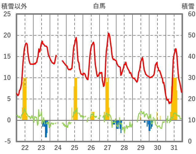 | 日 | 時 | 気温 | 降水 | 風向/風速 | 日照 | 積雪 | 降雪 |