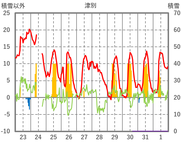 | 日 | 時 | 気温 | 降水 | 風向/風速 | 日照 | 積雪 | 降雪 |