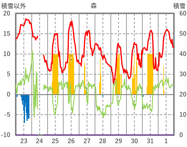 | 日 | 時 | 気温 | 降水 | 風向/風速 | 日照 | 積雪 | 降雪 |