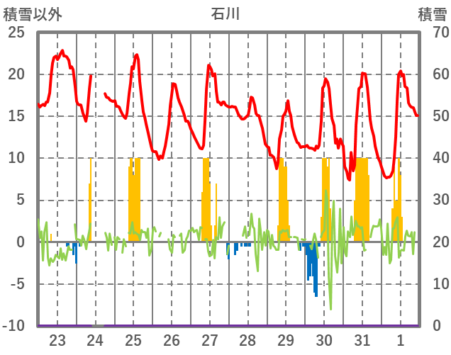 | 日 | 時 | 気温 | 降水 | 風向/風速 | 日照 | 積雪 | 降雪 |