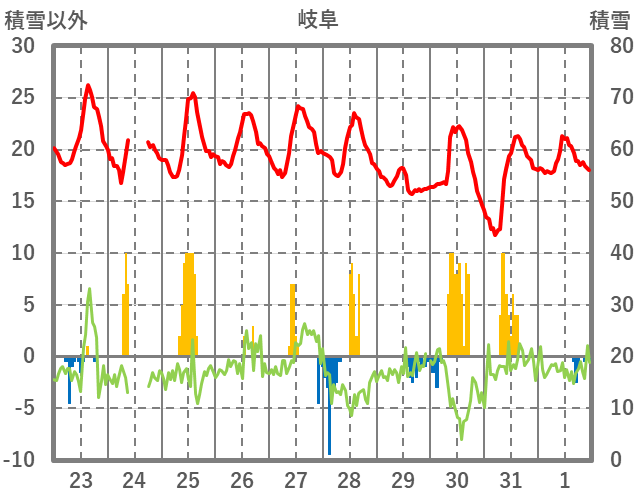 | 日 | 時 | 気温 | 降水 | 風向/風速 | 日照 | 積雪 | 降雪 |