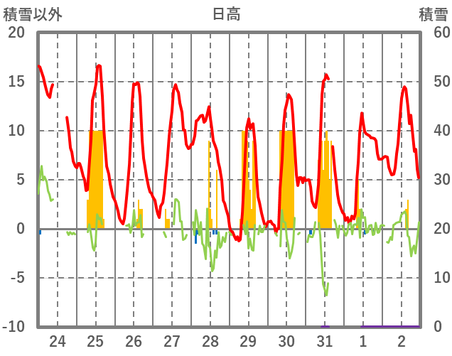 | 日 | 時 | 気温 | 降水 | 風向/風速 | 日照 | 積雪 | 降雪 |