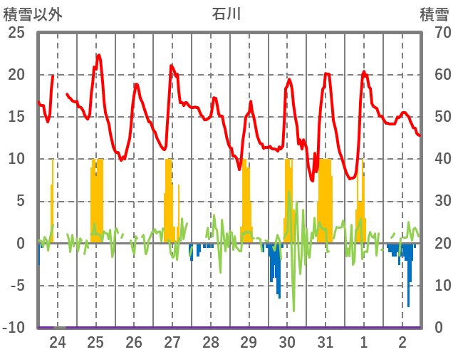 | 日 | 時 | 気温 | 降水 | 風向/風速 | 日照 | 積雪 | 降雪 |