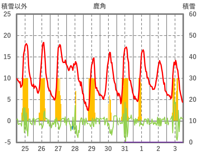 | 日 | 時 | 気温 | 降水 | 風向/風速 | 日照 | 積雪 | 降雪 |