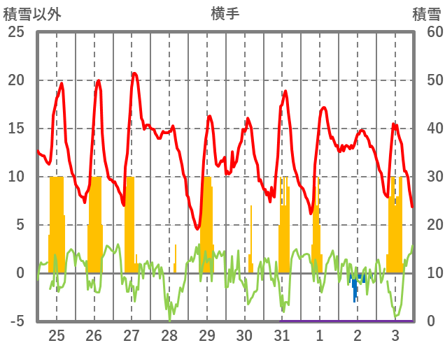 | 日 | 時 | 気温 | 降水 | 風向/風速 | 日照 | 積雪 | 降雪 |