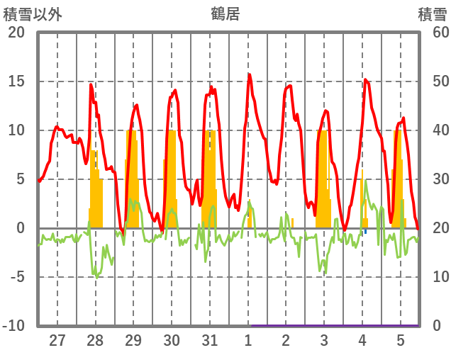| 日 | 時 | 気温 | 降水 | 風向/風速 | 日照 | 積雪 | 降雪 |