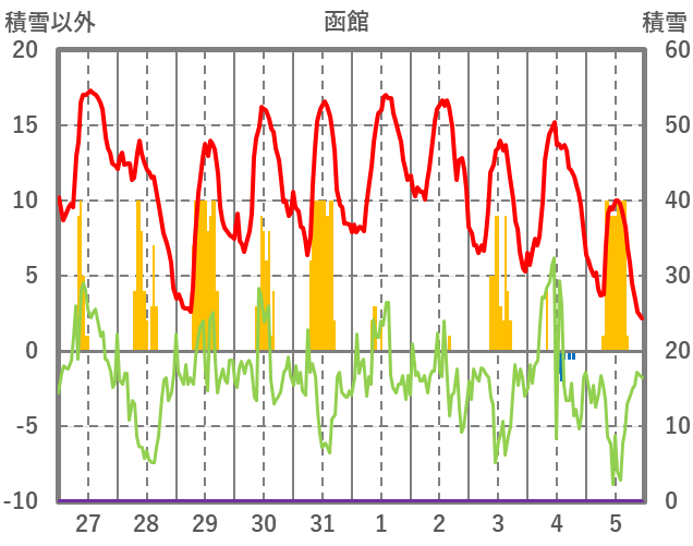 | 日 | 時 | 気温 | 降水 | 風向/風速 | 日照 | 積雪 | 降雪 |