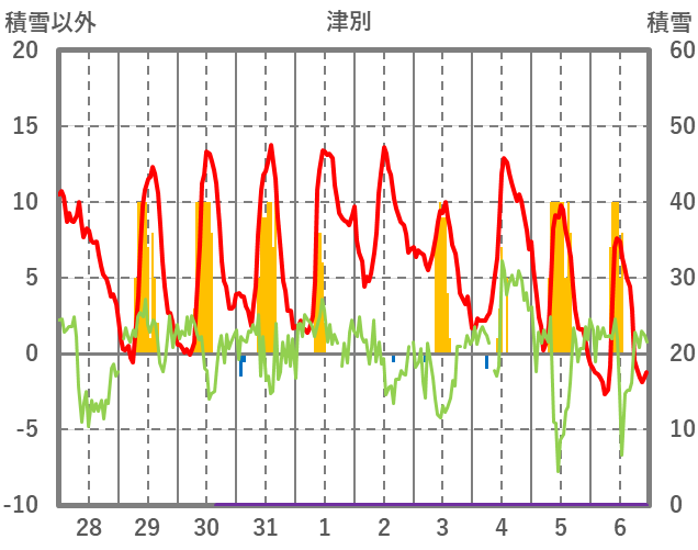 | 日 | 時 | 気温 | 降水 | 風向/風速 | 日照 | 積雪 | 降雪 |