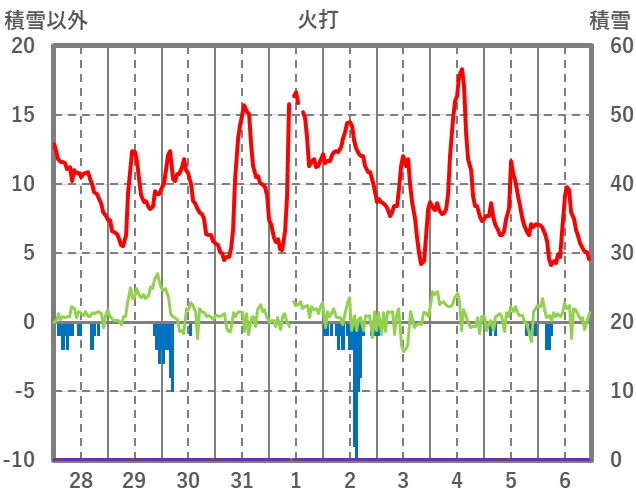 | 日 | 時 | 気温 | 降水 | 風向/風速 | 日照 | 積雪 | 降雪 |