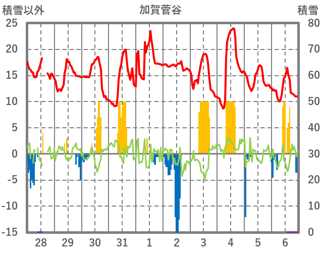 | 日 | 時 | 気温 | 降水 | 風向/風速 | 日照 | 積雪 | 降雪 |