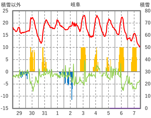 | 日 | 時 | 気温 | 降水 | 風向/風速 | 日照 | 積雪 | 降雪 |