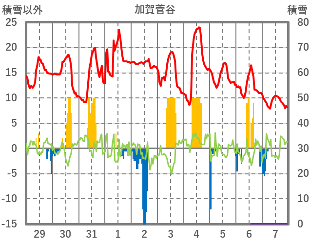 | 日 | 時 | 気温 | 降水 | 風向/風速 | 日照 | 積雪 | 降雪 |