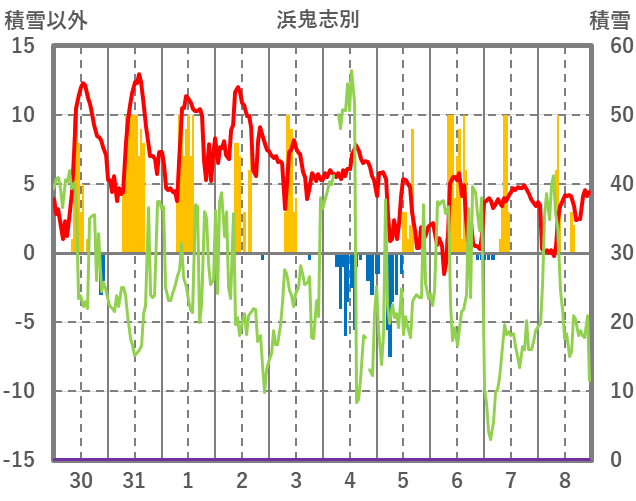 | 日 | 時 | 気温 | 降水 | 風向/風速 | 日照 | 積雪 | 降雪 |