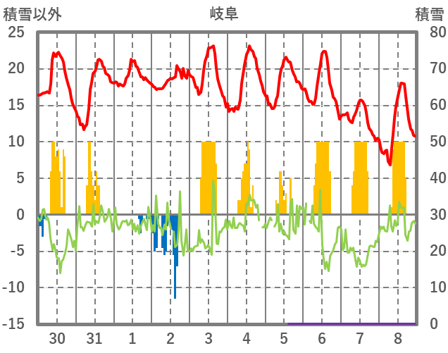 | 日 | 時 | 気温 | 降水 | 風向/風速 | 日照 | 積雪 | 降雪 |