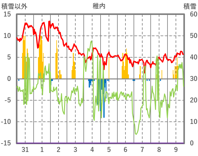 | 日 | 時 | 気温 | 降水 | 風向/風速 | 日照 | 積雪 | 降雪 |