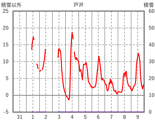 | 日 | 時 | 気温 | 降水 | 風向/風速 | 日照 | 積雪 | 降雪 |