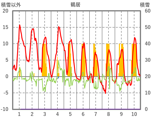 | 日 | 時 | 気温 | 降水 | 風向/風速 | 日照 | 積雪 | 降雪 |
