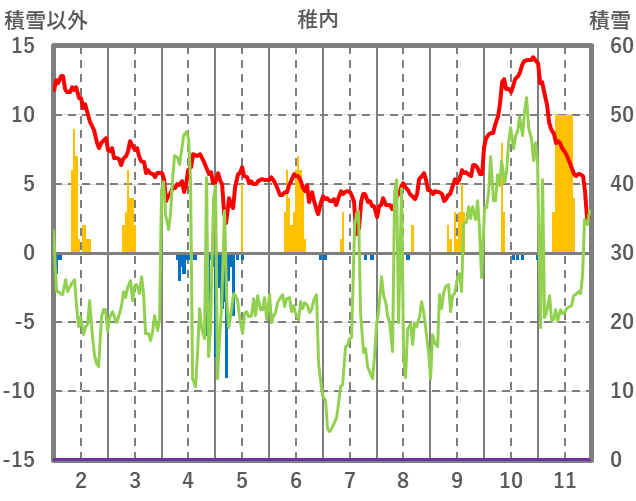| 日 | 時 | 気温 | 降水 | 風向/風速 | 日照 | 積雪 | 降雪 |