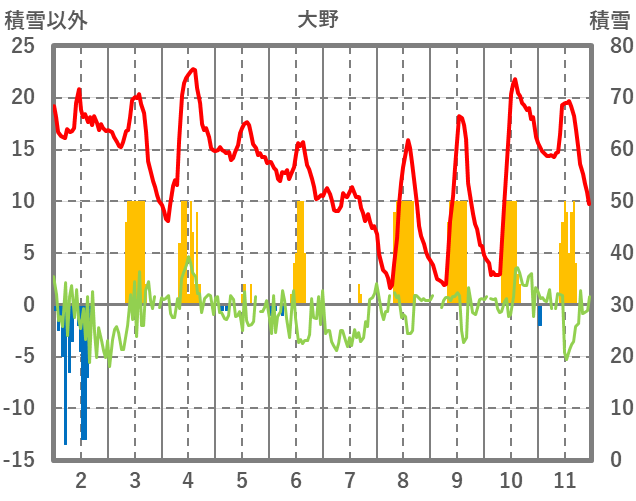 | 日 | 時 | 気温 | 降水 | 風向/風速 | 日照 | 積雪 | 降雪 |