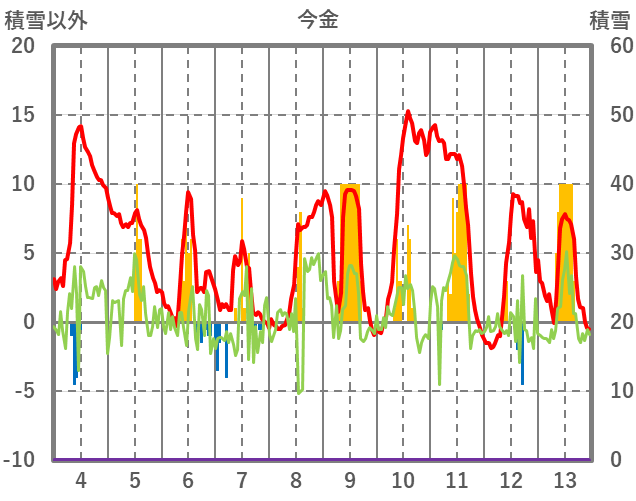 | 日 | 時 | 気温 | 降水 | 風向/風速 | 日照 | 積雪 | 降雪 |