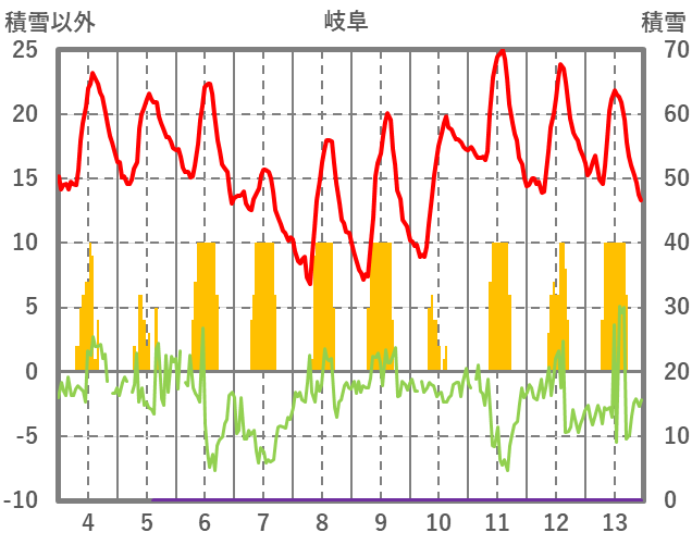 | 日 | 時 | 気温 | 降水 | 風向/風速 | 日照 | 積雪 | 降雪 |