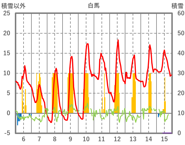 | 日 | 時 | 気温 | 降水 | 風向/風速 | 日照 | 積雪 | 降雪 |