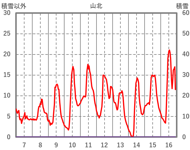| 日 | 時 | 気温 | 降水 | 風向/風速 | 日照 | 積雪 | 降雪 |