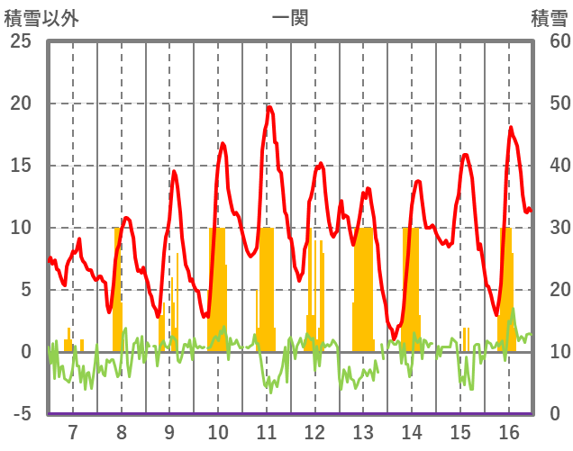 | 日 | 時 | 気温 | 降水 | 風向/風速 | 日照 | 積雪 | 降雪 |