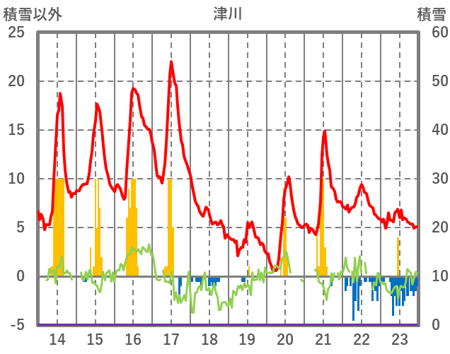 | 日 | 時 | 気温 | 降水 | 風向/風速 | 日照 | 積雪 | 降雪 |