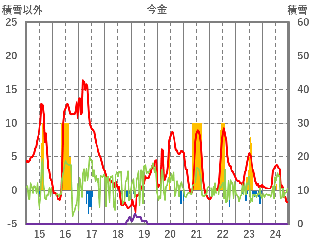 | 日 | 時 | 気温 | 降水 | 風向/風速 | 日照 | 積雪 | 降雪 |