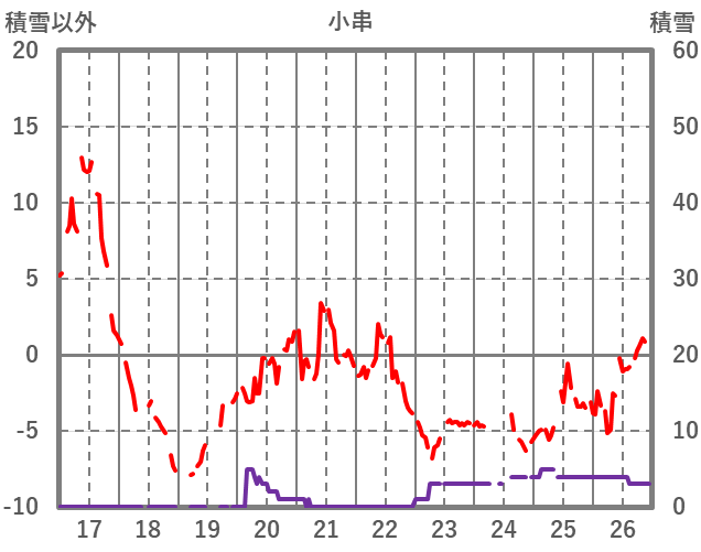 | 日 | 時 | 気温 | 降水 | 風向/風速 | 日照 | 積雪 | 降雪 |