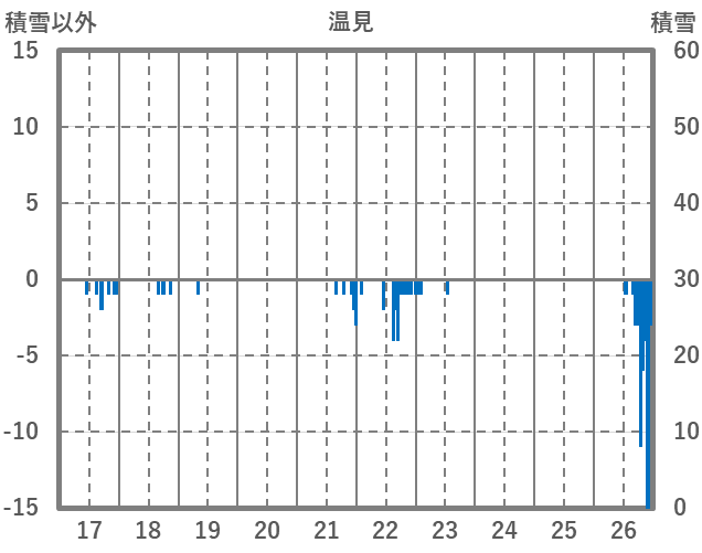 | 日 | 時 | 気温 | 降水 | 風向/風速 | 日照 | 積雪 | 降雪 |