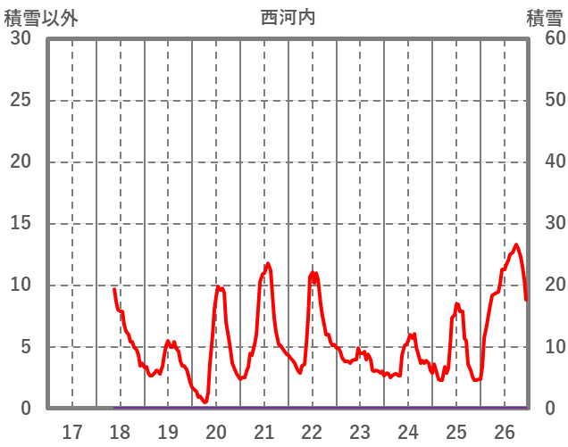 | 日 | 時 | 気温 | 降水 | 風向/風速 | 日照 | 積雪 | 降雪 |