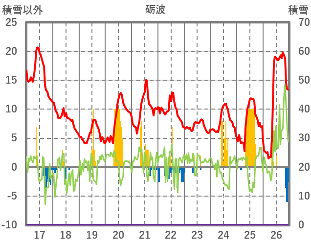 | 日 | 時 | 気温 | 降水 | 風向/風速 | 日照 | 積雪 | 降雪 |