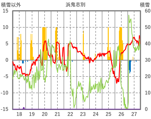 | 日 | 時 | 気温 | 降水 | 風向/風速 | 日照 | 積雪 | 降雪 |