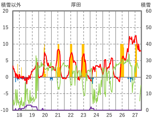 | 日 | 時 | 気温 | 降水 | 風向/風速 | 日照 | 積雪 | 降雪 |