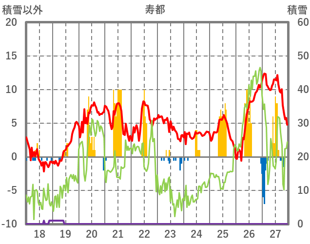| 日 | 時 | 気温 | 降水 | 風向/風速 | 日照 | 積雪 | 降雪 |
