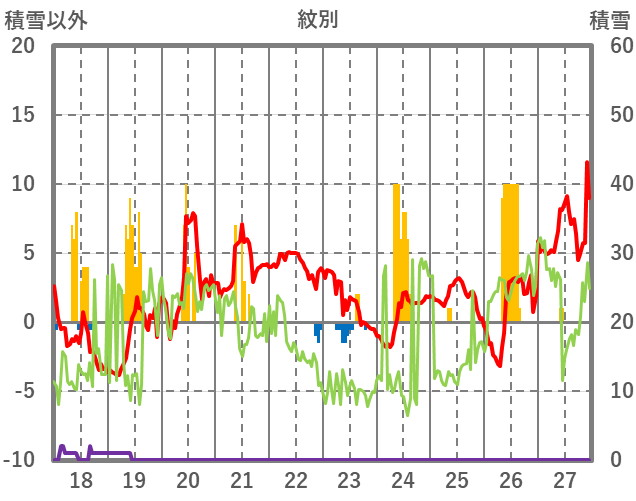 | 日 | 時 | 気温 | 降水 | 風向/風速 | 日照 | 積雪 | 降雪 |