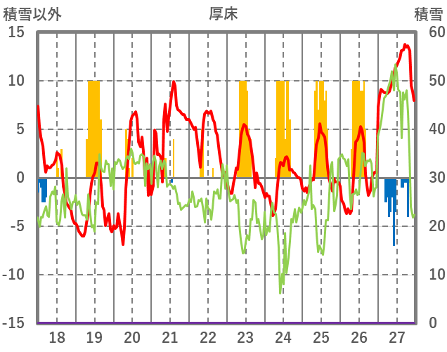 | 日 | 時 | 気温 | 降水 | 風向/風速 | 日照 | 積雪 | 降雪 |