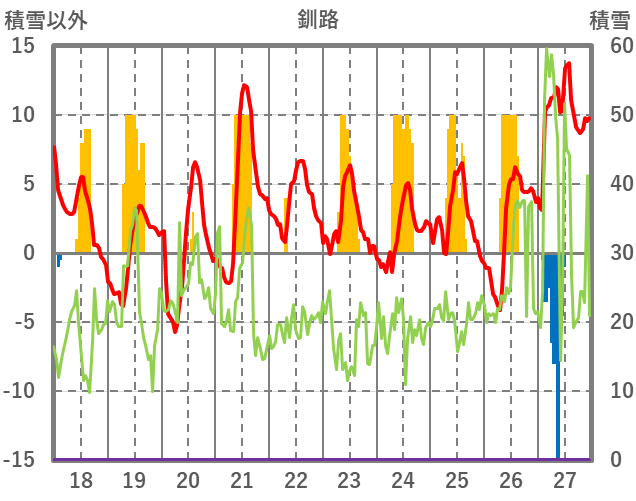 | 日 | 時 | 気温 | 降水 | 風向/風速 | 日照 | 積雪 | 降雪 |