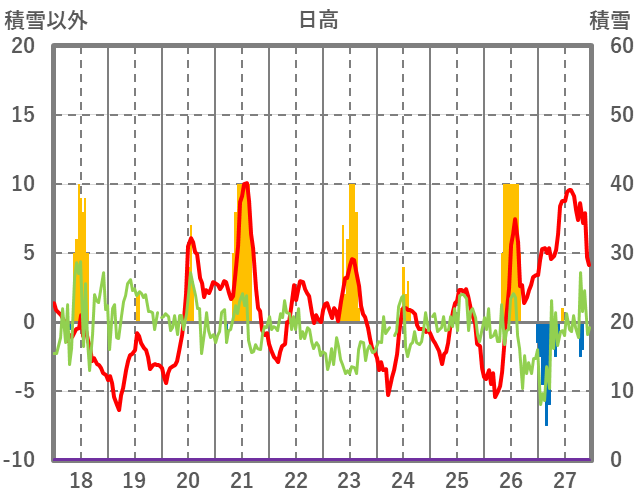 | 日 | 時 | 気温 | 降水 | 風向/風速 | 日照 | 積雪 | 降雪 |